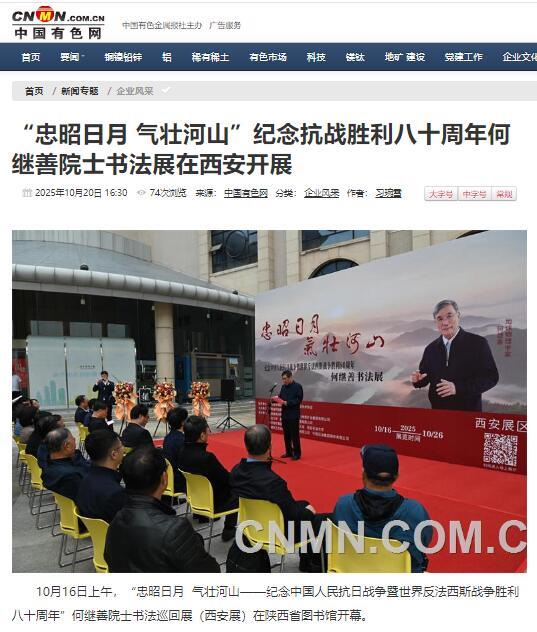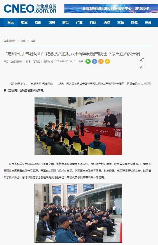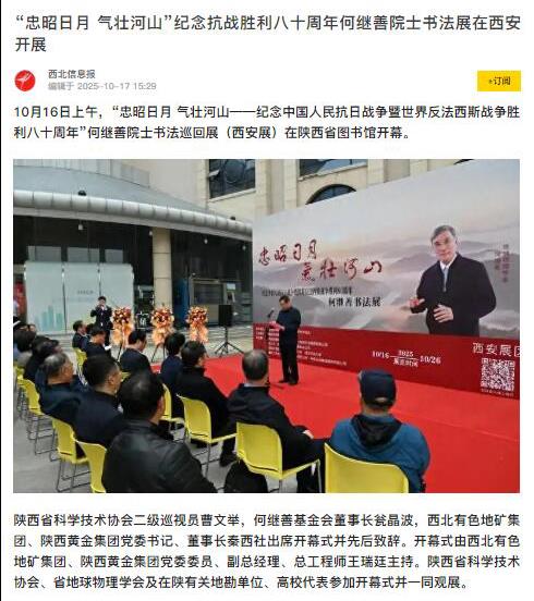 10月16日上午,为纪念中国人民抗日战争暨世界反法西斯战争胜利八十周年,“忠昭日月 气壮河山——何继善院士书法展”在陕西省图书馆开幕,地矿集团、黄金集团进行集中报道,活动引发社会广泛关注与热烈反响。据不完全统计,截至目前,活动已被中华网、陕西一套、消费日报、中国有色网、起点星空体育最新官网、丝路建设、西北信息报、陕工网、企业观察网、搜狐、网易星空体育最新官网、今日头条等媒体转载与刊播,形成了多维度、立体化的传播声势。
