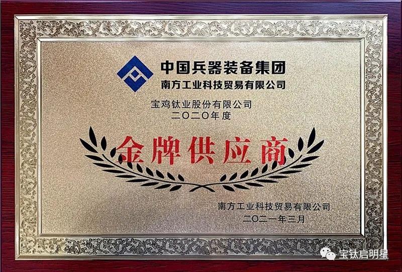 近日,宝钛股份喜获中国兵器装备集团南方工业科技贸易有限公司2020年度“金牌供应商”称号。