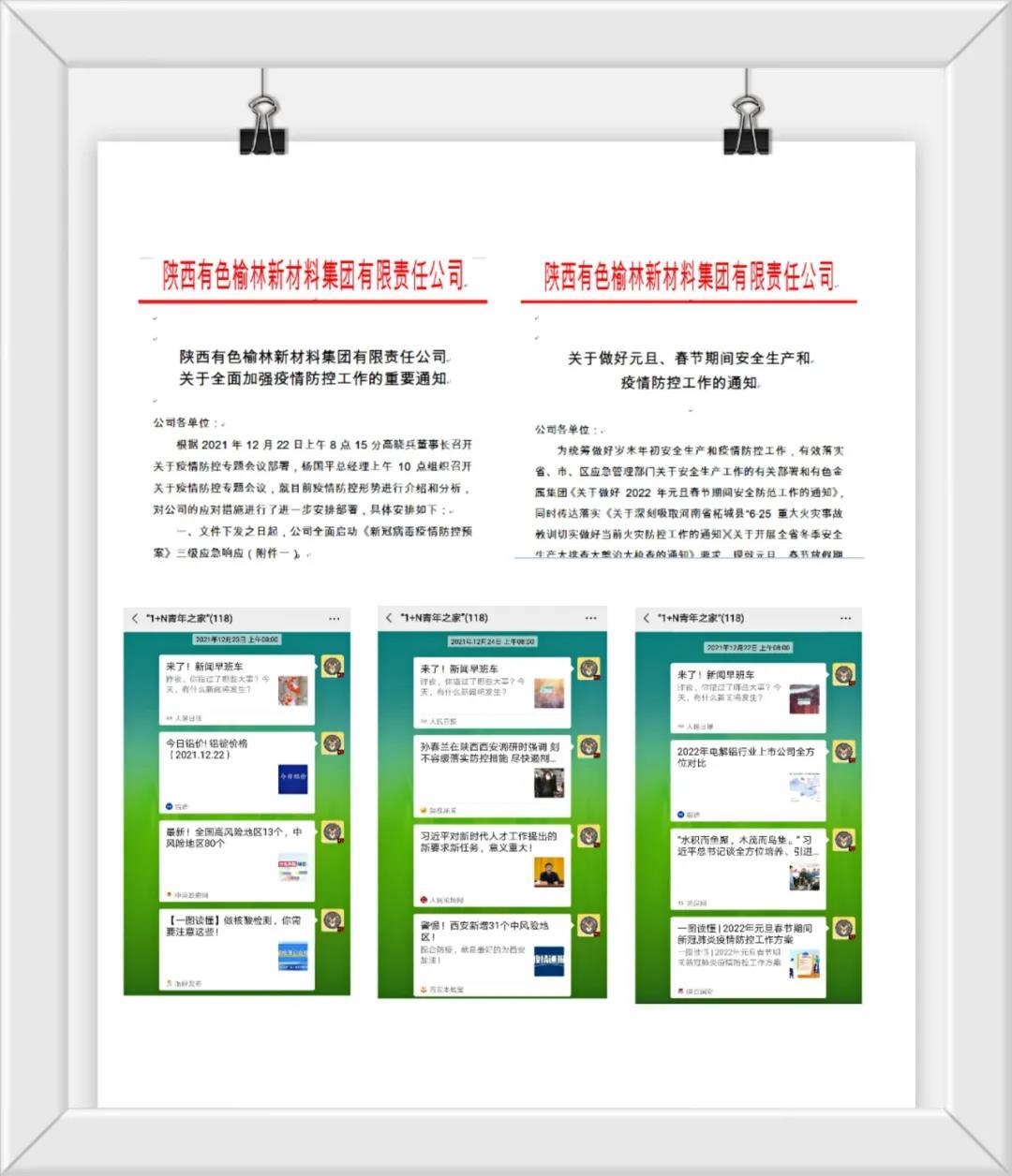 当前,我省疫情防控形势依然严峻复杂,防控工作正处于极其重要的关键期。在陕西有色金属集团党委的坚强领导下,榆林新材料集团上下万众一心、众志成城、坚定信心、科学防治,坚决打赢疫情防控这场硬仗。“党有号召,团有行动”。新材料集团团委深入贯彻公司党委部署要求,勇于担当、主动作为,动员广大团员青年科学有序参与疫情防控工作,用实际行动为疫情防控贡献青春力量!