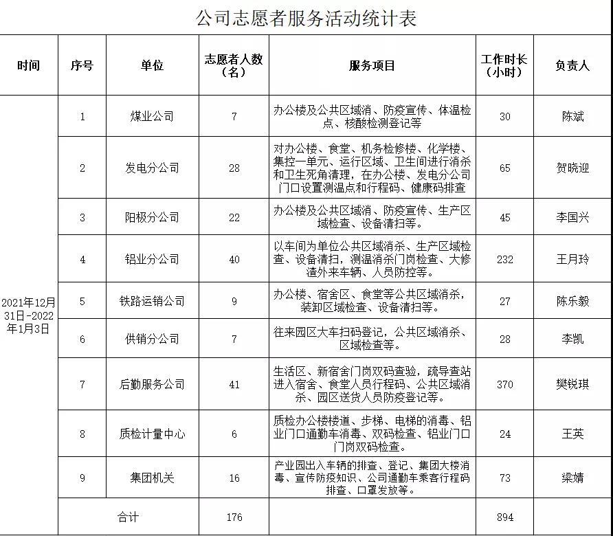 “凝聚青春正能量,众志成城抗疫情”。元旦期间公司团委“抗疫情,稳生产”志愿者服务活动,共有176名志愿者参与,开展志愿者服务活动项目十余项,累计服务时长约894小时。公司志愿服务工作仍在继续,广大团员青年仍将继续坚守。疫情防控,人人有责,请广大职工朋友做好自我防护,配合公司做好疫情防控各项工作,凝心聚力、众志成城、共同构筑牢固防疫屏障,为公司疫情防控和安全稳定生产做出新的更大贡献。