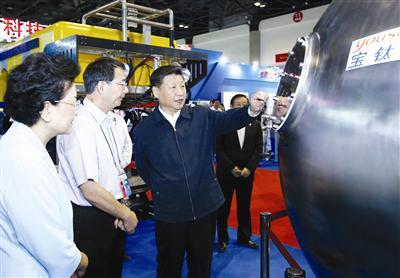 新华社照片,北京,2016年6月3日,中共中央总书记、国家主席、中央军委主席习近平在北京展览馆参观国家“十二五”科技创新成就展时,在宝钛集团生产的4500米深潜器球壳前驻足了解情况,并给予高度评价。 新华社记者 鞠鹏 摄