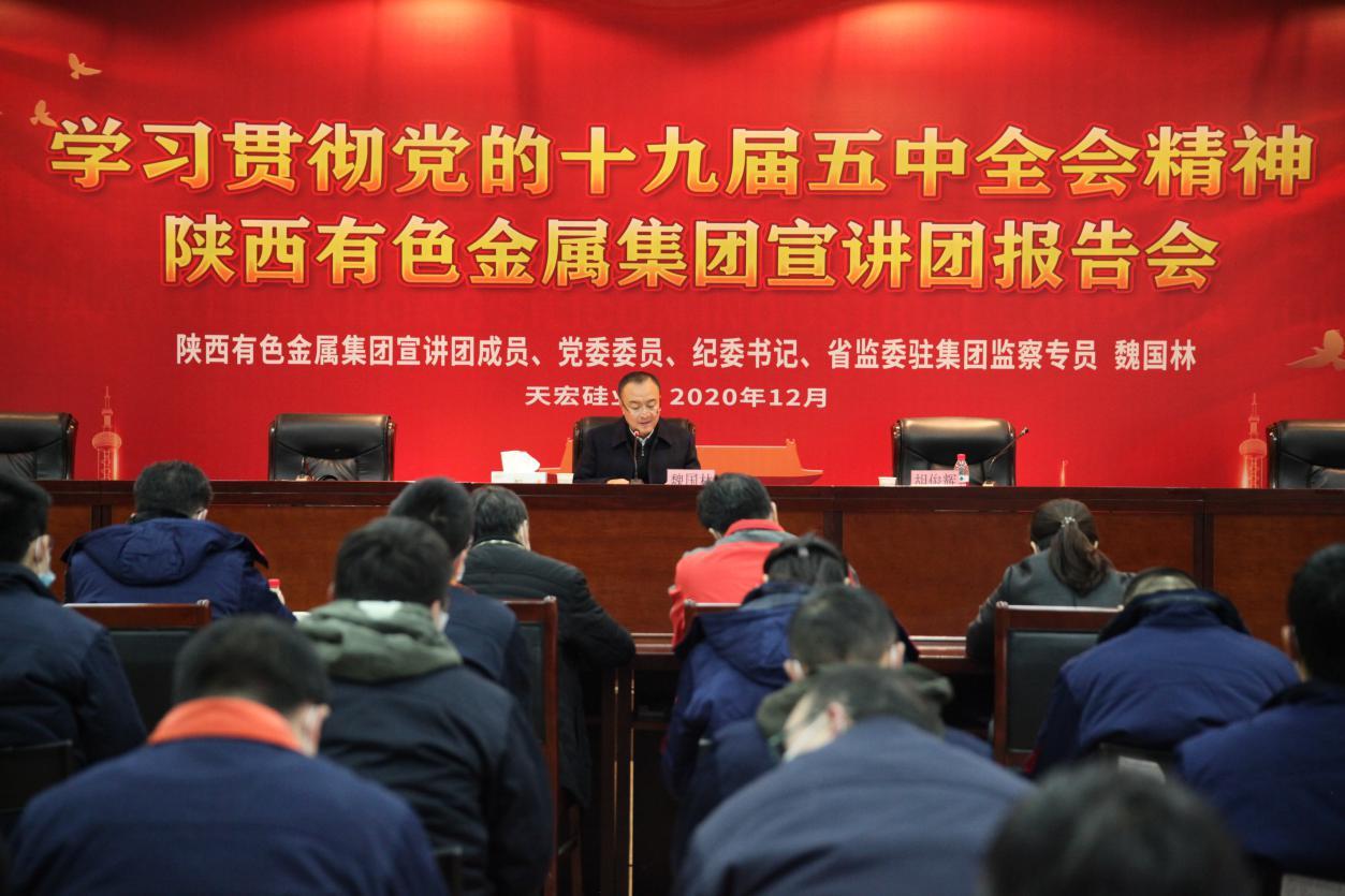 12月4日,学习宣传贯彻党的十九届五中全会精神陕西有色金属集团宣讲团在天宏硅业进行宣讲。陕西有色金属集团宣讲团成员、党委委员、纪委书记、省监委驻集团公司监察专员魏国林作宣讲报告。集团公司纪委副书记苏怀岗、党委巡察办主任陈桂琼等有关人员参加会议。会议由天宏硅业党委书记、董事长胡俊辉主持。