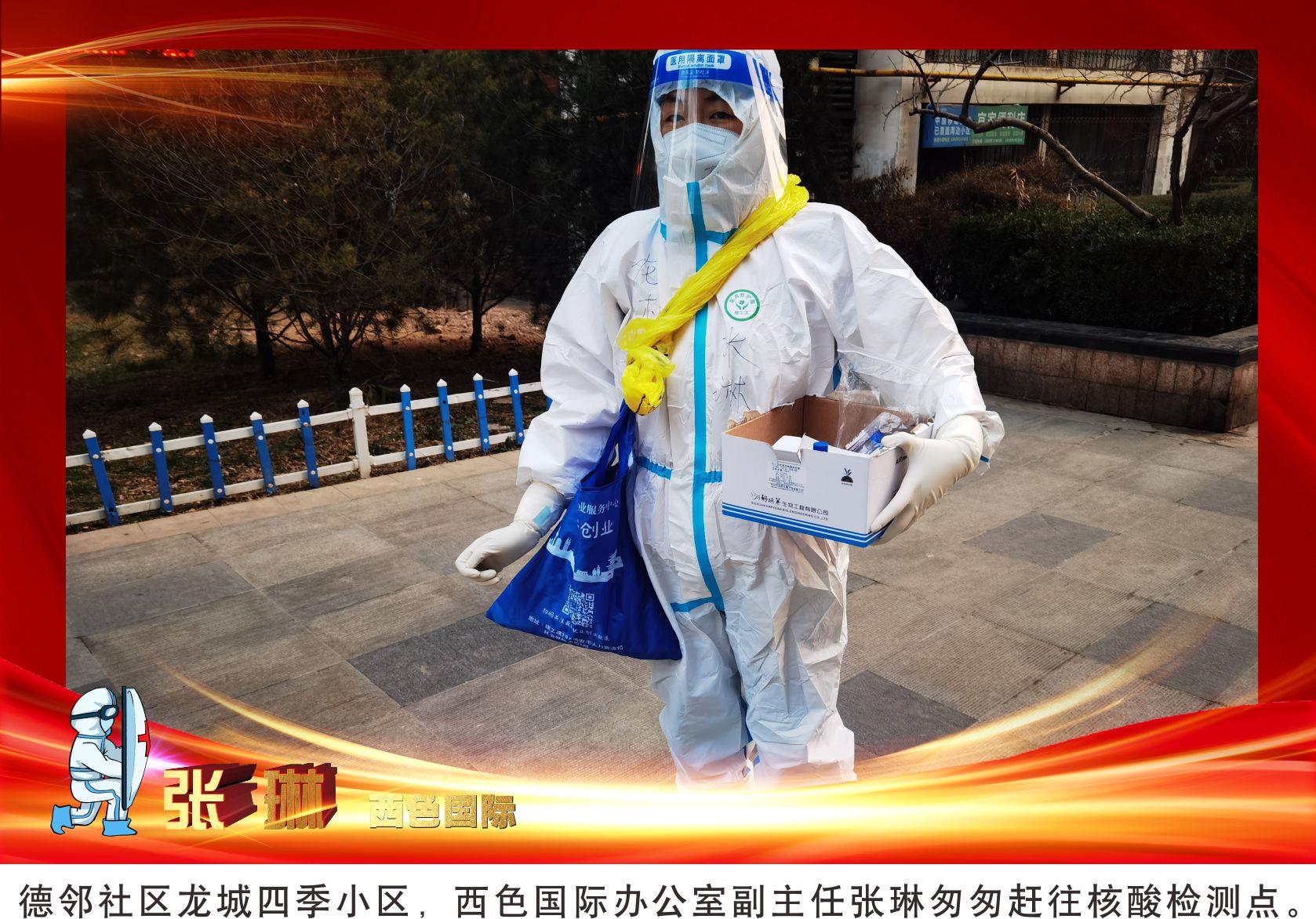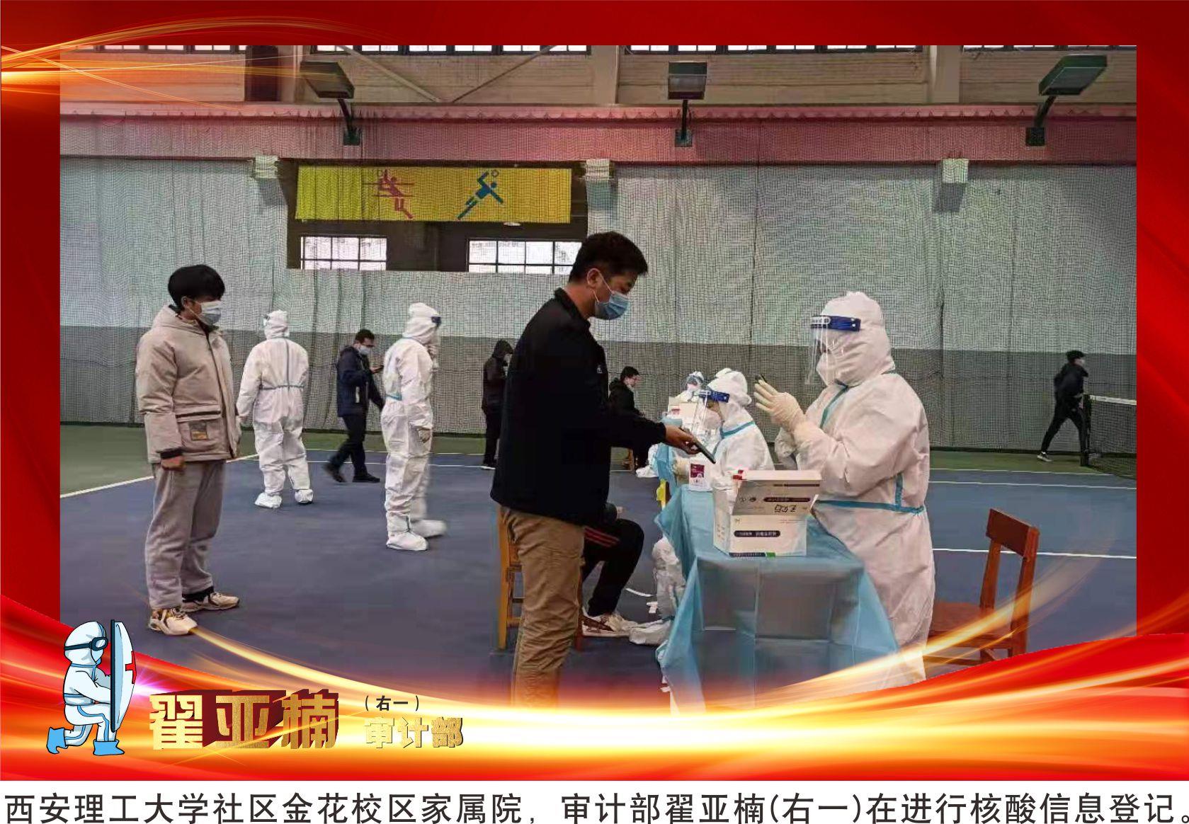 2022年1月4日,作为地矿集团、黄金集团本部抗击疫情党员先锋小队20余名队员之一,审计部翟亚楠和所属服务社区的下沉干部们从早7点忙到了晚6点,为西安理工大学社区金花校区4000多名学生完成了核酸检测。从开始的准备,到物资分配、扫码核检、现场组织、清理打包全程参与。为了节省防护物资,12个小时连续工作没有吃喝,真切体会到了一线医护人员的辛苦。她呼吁大家尽可能节约防疫物资、做好自身防护,用实际行动支持一线人员的工作。