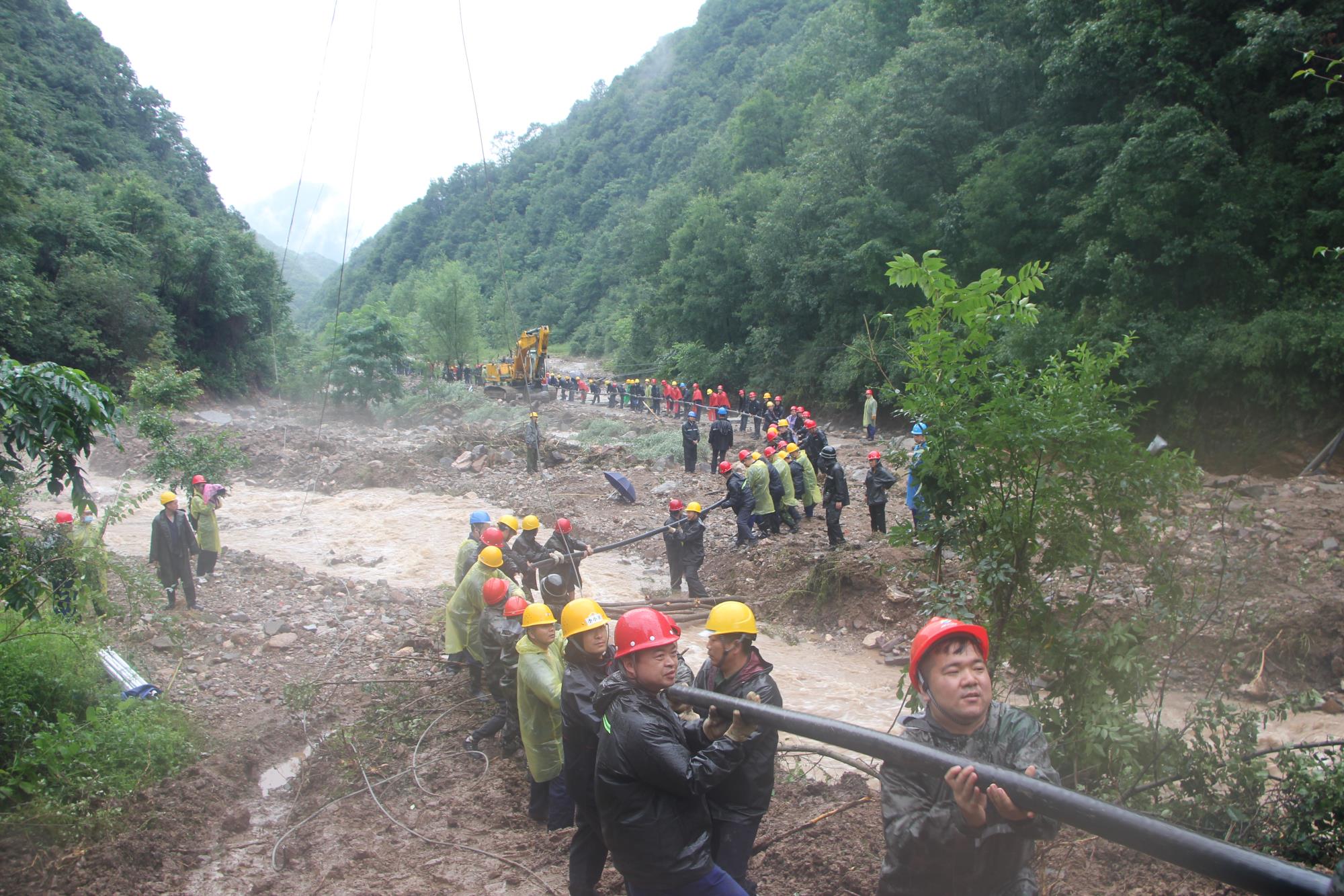 为尽快恢复矿区供电、供水、通讯等民生需求,保障矿区职工家属的正常生活,在麻家砭水库电力设施抢修中,150余名抢险队员翻山越岭,更是靠人拉肩扛将600余米电缆运送到作业现场,冒着大雨进行电缆铺设,在水流没过膝盖的抢修现场连续奋战20小时没合眼……