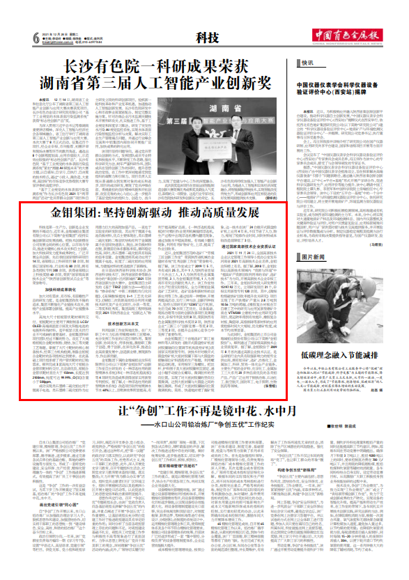在日前由陕西省科学技术协会、陕西省科学技术厅、陕西省国资委等联合举办的“秦创原-泾河新城杯”2021年陕西省创新方法大赛中,金钼集团自主研发的《基于TRIZ创新方法——钼合金粉“掺杂系统”中第二相微粒均匀化问题》、《高铼酸铵提纯3+1工艺优化研究》、《铜钼二次资源高效综合利用关键技术研究及产业化》项目,分获一等奖、二等奖和优秀奖,集团高级工程师张晓荣获2021年陕西省企业“创新达人”称号。