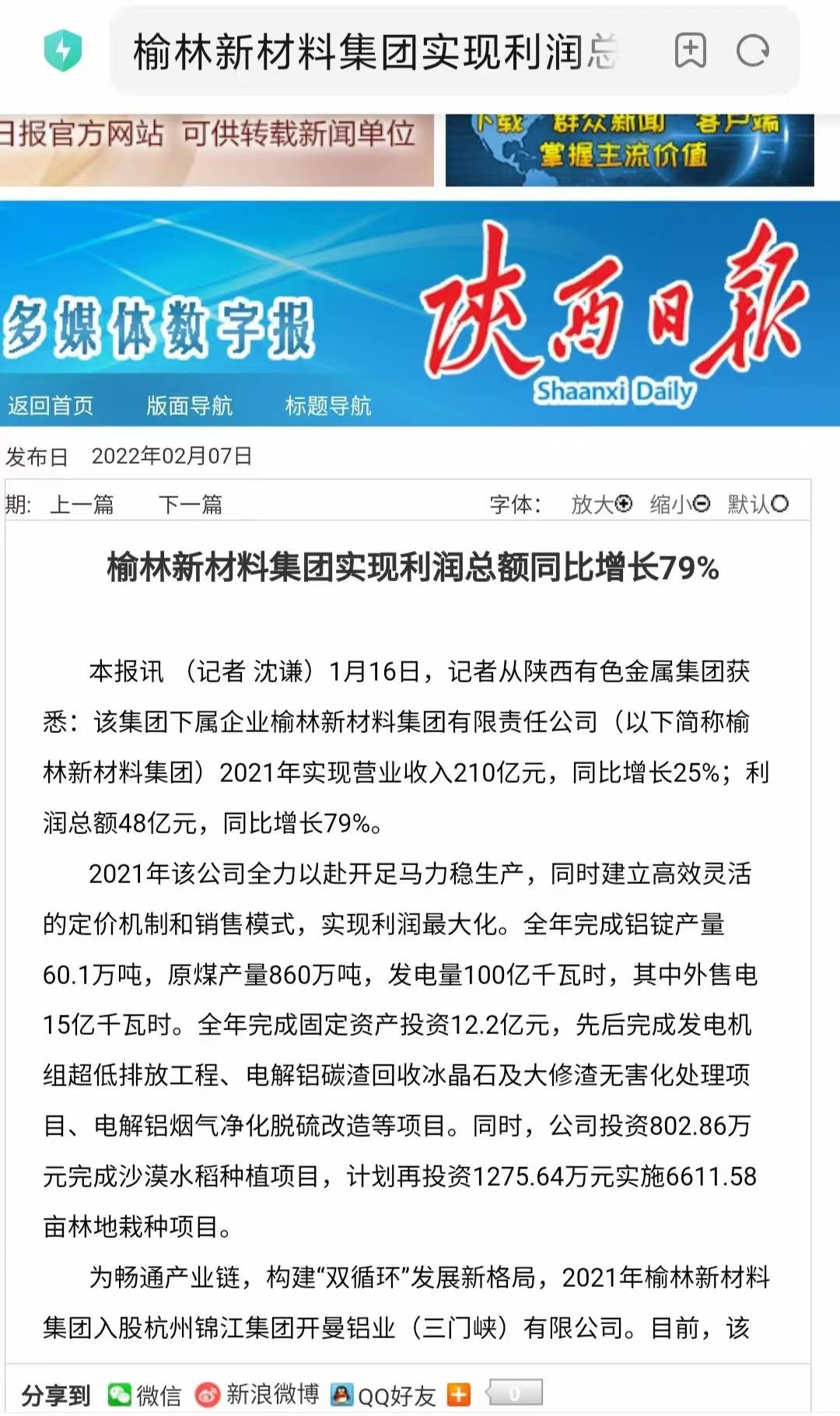 1月16日,记者从陕西有色金属集团获悉:该集团下属企业榆林新材料集团有限责任公司(以下简称榆林新材料集团)2021年实现营业收入210亿元,同比增长25%;利润总额48亿元,同比增长79%。