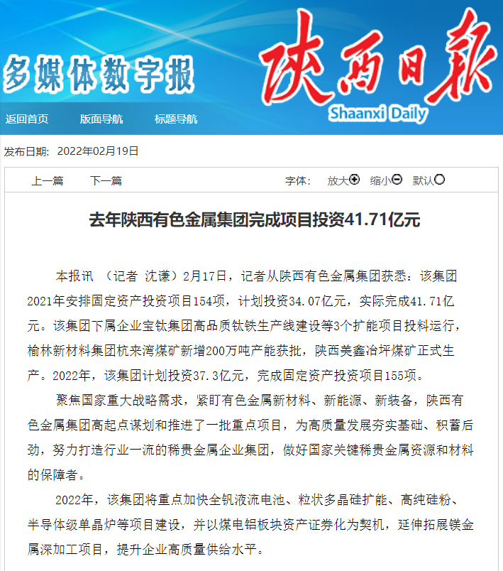 陕西日报:去年陕西有色金属集团完成项目投资41.71亿元