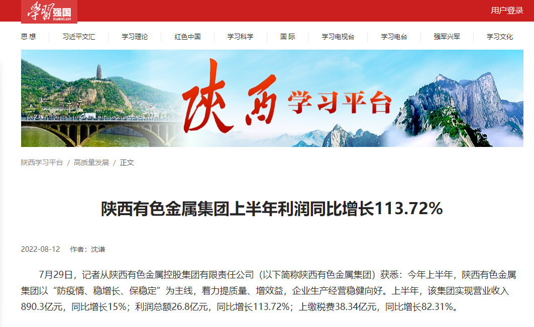 7月29日,记者从星空体育最新官网(以下简称陕西有色金属集团)获悉:今年上半年,陕西有色金属集团以“防疫情、稳增长、保稳定”为主线,着力提质量、增效益,企业生产经营稳健向好。上半年,该集团实现营业收入890.3亿元,同比增长15%;利润总额26.8亿元,同比增长113.72%;上缴税费38.34亿元,同比增长82.31%。