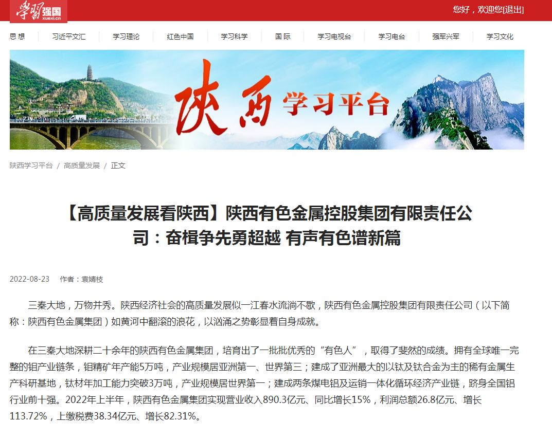 在三秦大地深耕二十余年的陕西有色金属集团,培育出了一批批优秀的“有色人”,他们通过辛勤劳动和创新智慧,在国家改革开放政策的指引下,坚持与时俱进、深化改革和持续发展,弘扬“让资源更有价值”的“聚”文化理念,取得了斐然的成绩。拥有全球唯一完整的钼产业链条,钼精矿年产能5万吨,产业规模居亚洲第一、世界第三;建成了亚洲最大的以钛及钛合金为主的稀有金属生产科研基地,钛材年加工能力突破3万吨,产业规模居世界第一;建成两条煤电铝及运销一体化循环经济产业链,跻身全国铝行业前十强。数字是最好的证明: 2022年上半年,陕西有色金属集团实现营业收入890.3亿元、同比增长15%,利润总额26.8亿元、增长113.72%,上缴税费38.34亿元、增长82.31%。