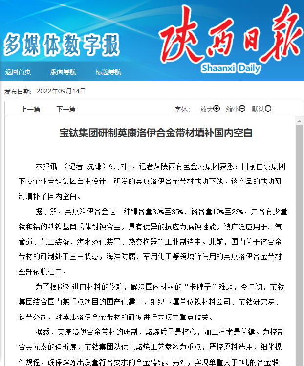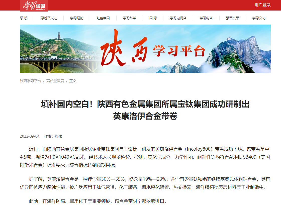 近日,由陕西有色金属集团所属企业宝钛集团自主设计、研发的英康洛伊合金(Incoloy800)带卷成功下线。该带卷单重4.5吨,规格为1.0×1040×C毫米。经技术人员现场检验、检测,其化学成分、力学性能、耐蚀性等均符合ASME SB409(美国阿斯米合金)标准要求,综合指标达到预期目标。