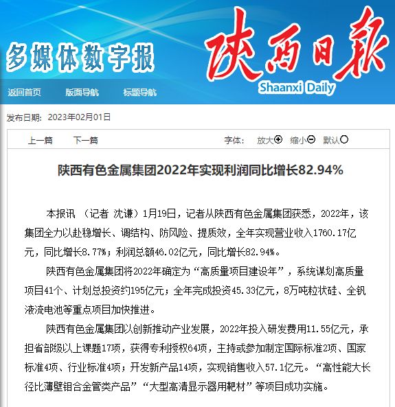 陕西日报:陕西有色金属集团2022年实现利润同比增长82.94%