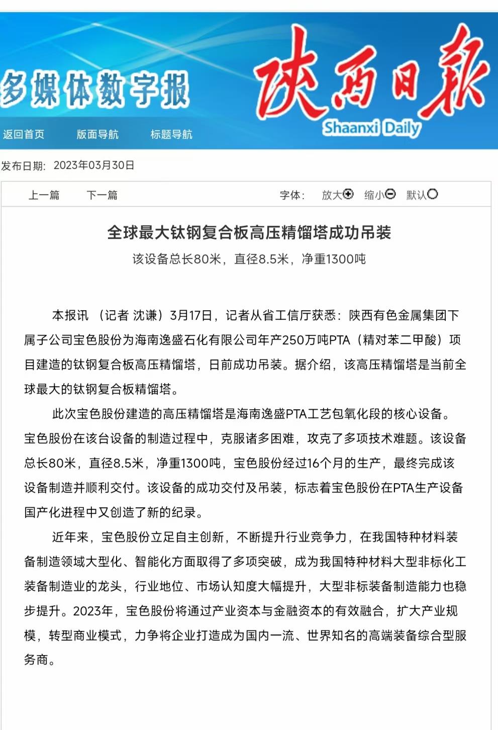 陕西日报:全球最大钛钢复合板高压精馏塔成功吊装