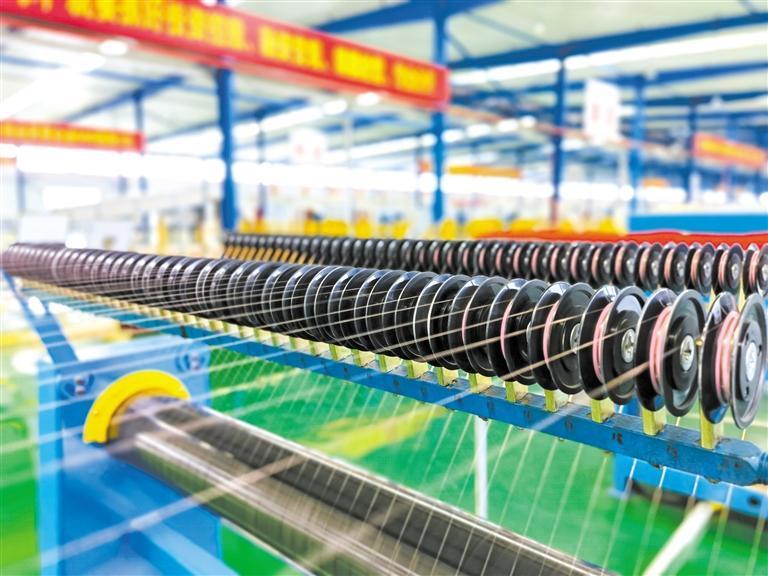 4月6日,在正威宝鸡铜基新材料产业基地项目年产10万吨精密铜线生产车间内,铜杆原材料经过精密仪器加工后,变成了精密铜线。 本报记者 李宛嵘摄