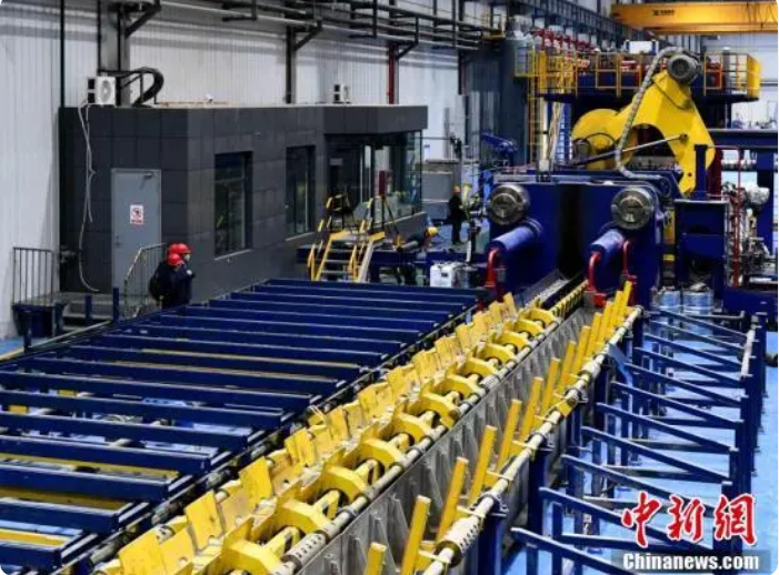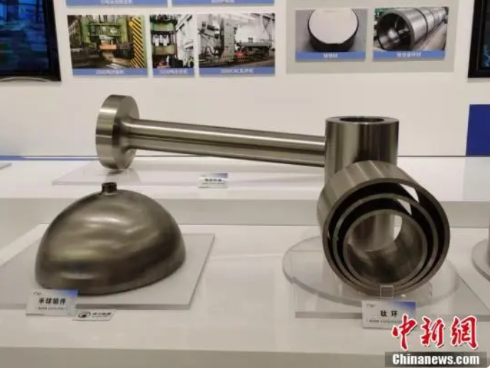 近日,“高质量发展调研行”采访团来到位于陕西省宝鸡市的宝钛集团。据介绍,作为一种金属,钛具有耐腐蚀、亲生物、质量轻等特点,因此被广泛应用于航空工业、家居用品、医疗器械等方面。在宝钛集团展览馆内,摆放着用钛金属制作的直升飞机、潜水设备、锅碗瓢盆、医疗器械等产品。工作人员表示,自1965年建企以来,宝钛集团构建了从海绵钛制备,到熔炼、加工、深加工及装备制造的全产业链。为中国航空、航天、海洋和民用等多领域用钛需求提供了支持,产品远销50多个国家和地区。据悉,2022年,宝鸡钛材生产加工量约6.5万吨,占到全国的65%、世界的33%以上,钛产业集群实现产值610亿元。图为宝钛集团高品质钛及钛合金管材、型材生产线。宝钛集团 供图