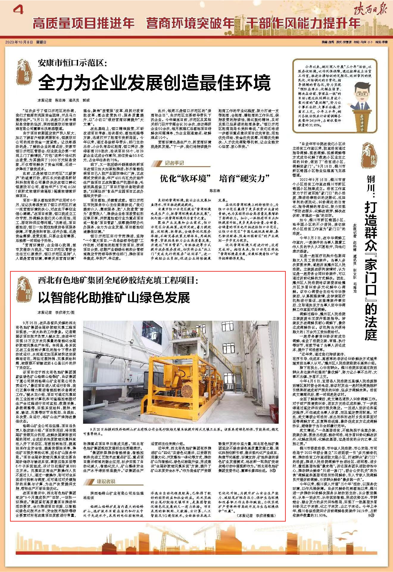 《陕西日报》10月8日讯:9月25日,在凤县留凤关镇的西北有色地矿集团全尾砂胶结充填工程项目现场,一派火热的工作景象。记者跟随该项目技术负责人樊水龙,走进年可实现18万立方米充填量的智能化全尾砂胶结充填生产车间。车间里,各系统正在工业控制计算机的指令下带水联动试运行,水流通过加压泵被投送到深锥浓密机,再经过搅拌桶、充填泵给料箱,被源源不断输送到4公里以外的井下采空区。