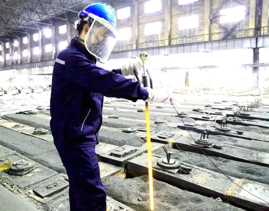 不管是早班还是晚班,我们这些熟练工基本都是满负荷作业,更不用说新人。”王彦龙说。跟随王彦龙走进车间,此时电解槽旁的温度更是高达60℃以上。在一顿繁杂的操作后,王彦龙指挥天车将残极提了起来,捞块、扒沉淀……整个作业持续了30分钟左右。