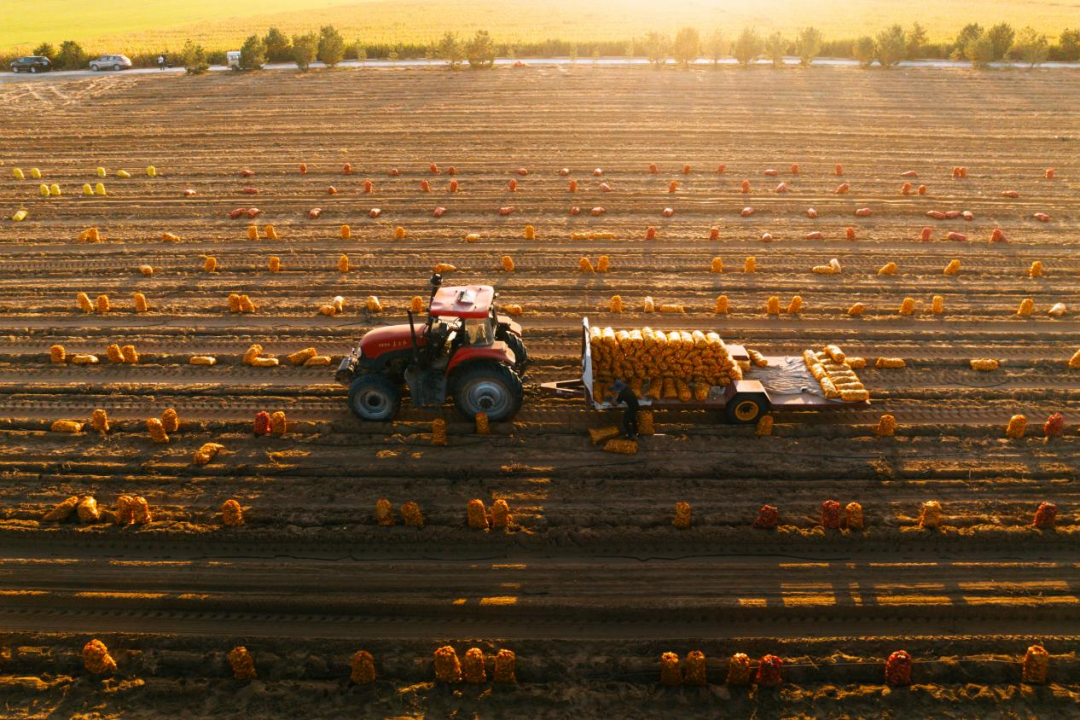 金秋时节,陕西大地种业(集团)有限公司第二农场丰收在望,一袋袋分拣完成的沙地土豆整齐地堆在田间,等待装车发货。