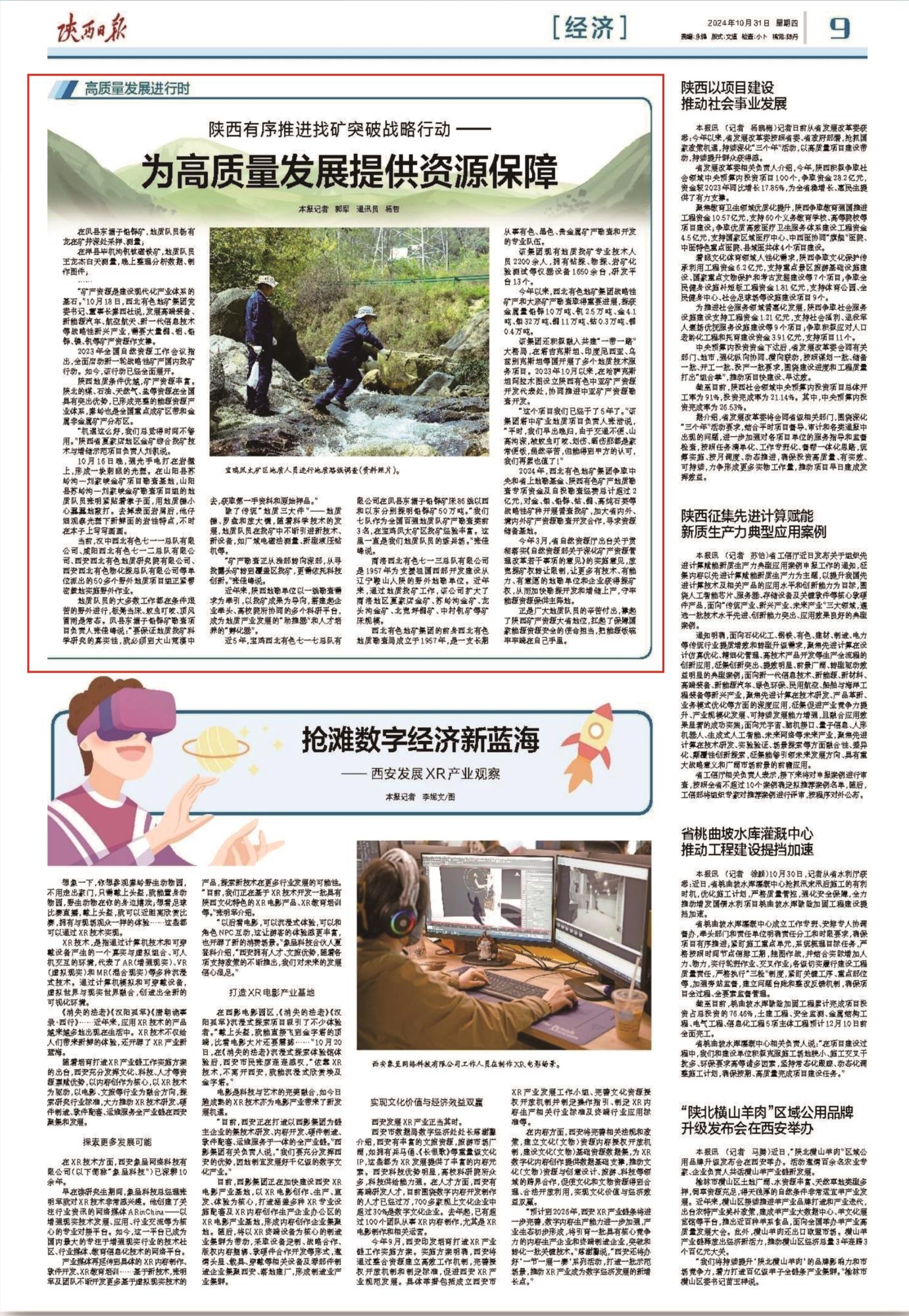2024年,西北有色地矿集团争取中央和省上地勘基金、陕西有色矿产地质勘查专项资金及自投勘查经费总计超过2亿元,对金、钼、铅锌、钴、铜、高纯石英等战略性矿种开展普查找矿,加大省内外、境内外矿产资源勘查开发合作,寻求资源储备基地。