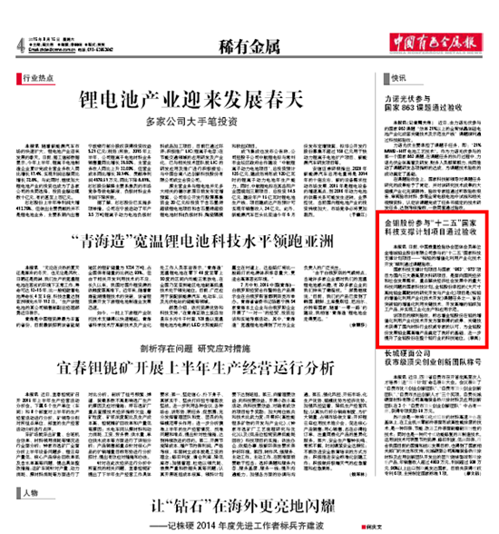 中国有色金属报:金钼股份参与“十二五”国家科技支撑计划项目通过验收