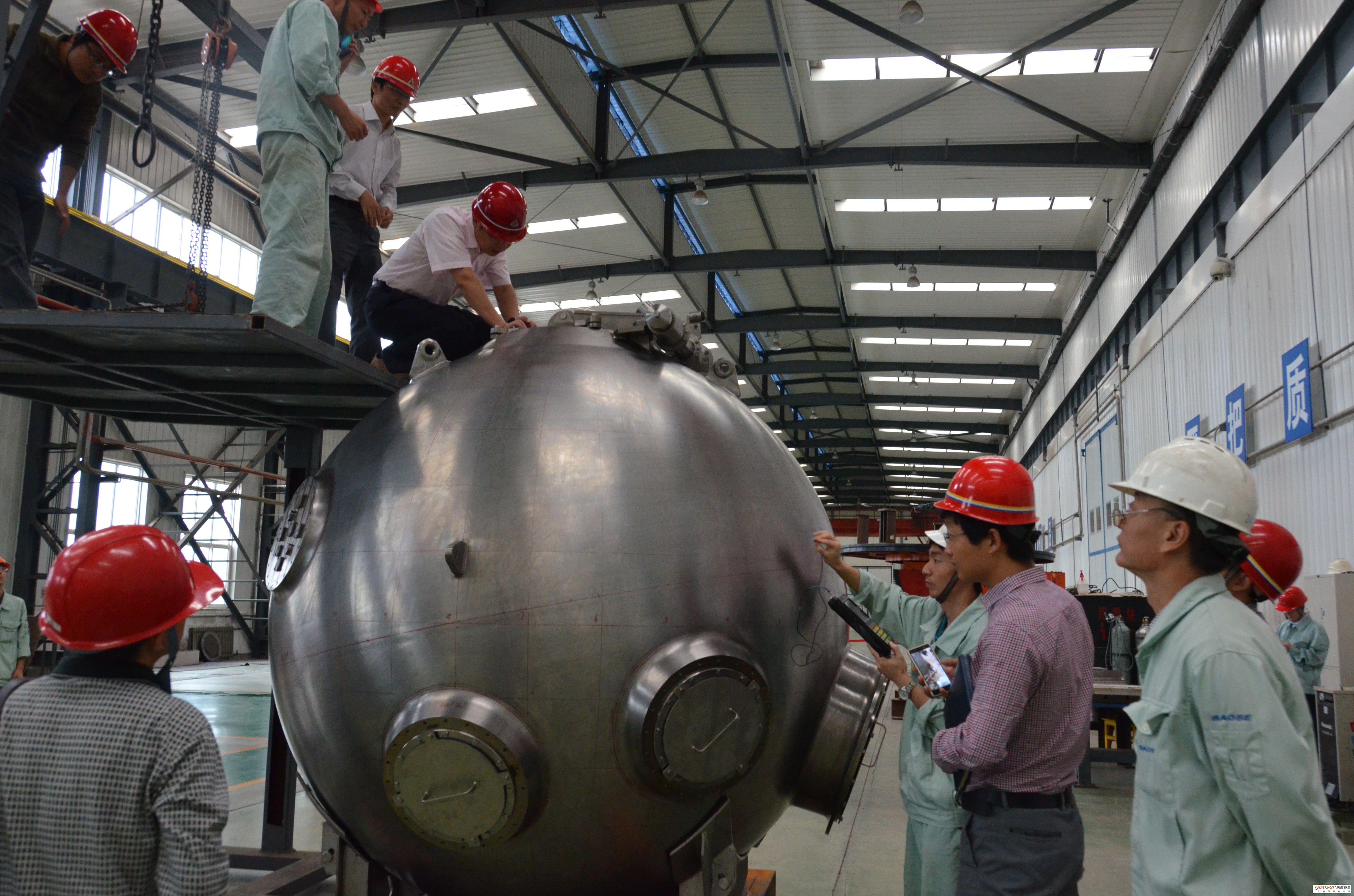 在这个项目研制团队中,课题组副组长王韦琪在现场一线,研究关键技术的突破;高级工程师张永强全身心地做好项目协调、内外联络工作;宽厚板公司副经理容耀、高级工程师庞洪在板材轧制的工艺及质量控制中,“蹲”在现场,严格把关,确保不出差错;高级工程师王剑虹、苑晓刚在后期球壳的加工焊接这个关键工序中,同技师们打成一片,严格把握工序过程,使焊接过程不出一丝纰漏;教授级高工王永梅在项目管理、检验等环节积极与专家、外部单位协调。公司熔铸厂、锻造厂、板带厂及宽厚板公司、线材厂、宝色特种设备等单位积极协同,做好各自工序研制。众人的智慧,团队的力量,使项目研制得以顺利进行。