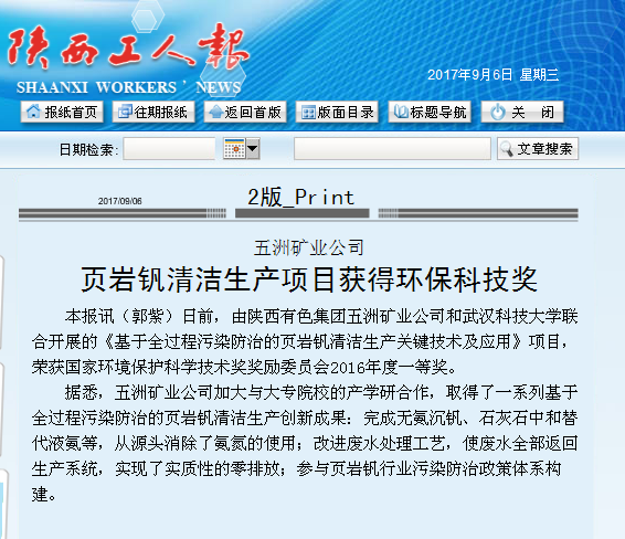 陕西工人报:五洲矿业公司页岩钒清洁生产项目获得环保科技奖