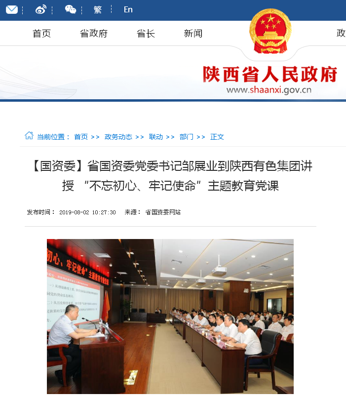 8月1日下午,根据中央、省委和省国资委党委“不忘初心、牢记使命”主题教育部署,省国资委党委书记邹展业到陕西有色集团,以《悟初心、守初心、践初心,以一流党建推动省属企业高质量发展》为题给党员领导干部上了一堂内涵深刻、生动精彩的专题党课。陕西有色集团党委书记、董事长马宝平主持党课。