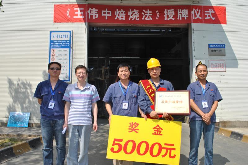 钼炉料产品部引进并建成投产的氧化钼多膛焙烧炉,因同时点燃各层所有燃烧器,导致炉内温度过高,物料升华现象严重,结料较多,产品质量下降,天然气损耗大。王伟中留心观察,钻研技术,发现焙烧炉料烧结结块的根本原因在于温度偏高,他创新性地采取了关闭部分炉层的燃烧器,调整进气孔的开度大小,从而控制物料反应速度,使高温炉层比原来降低40℃, 同时,利用物料自燃放热,为焙烧提供热量,有效遏制了焙烧过程中物料的烧结和升华,保证了产品质量,提高了金属回收率,累计多回收金属3吨,价值约30万元,而且天然气消耗显著降低,节约了成本。通过低温焙烧,在保证产品质量的同时,天然气单耗由100多立方米降到50多立方米,不但比国内同类行业低,而且比国际同类行业还低1.6立方米,仅此一项,累计为企业节约成本1470万元。“王伟中低温焙烧法”也因此在金钼集团首届职工技术创新活动中获得命名奖励。