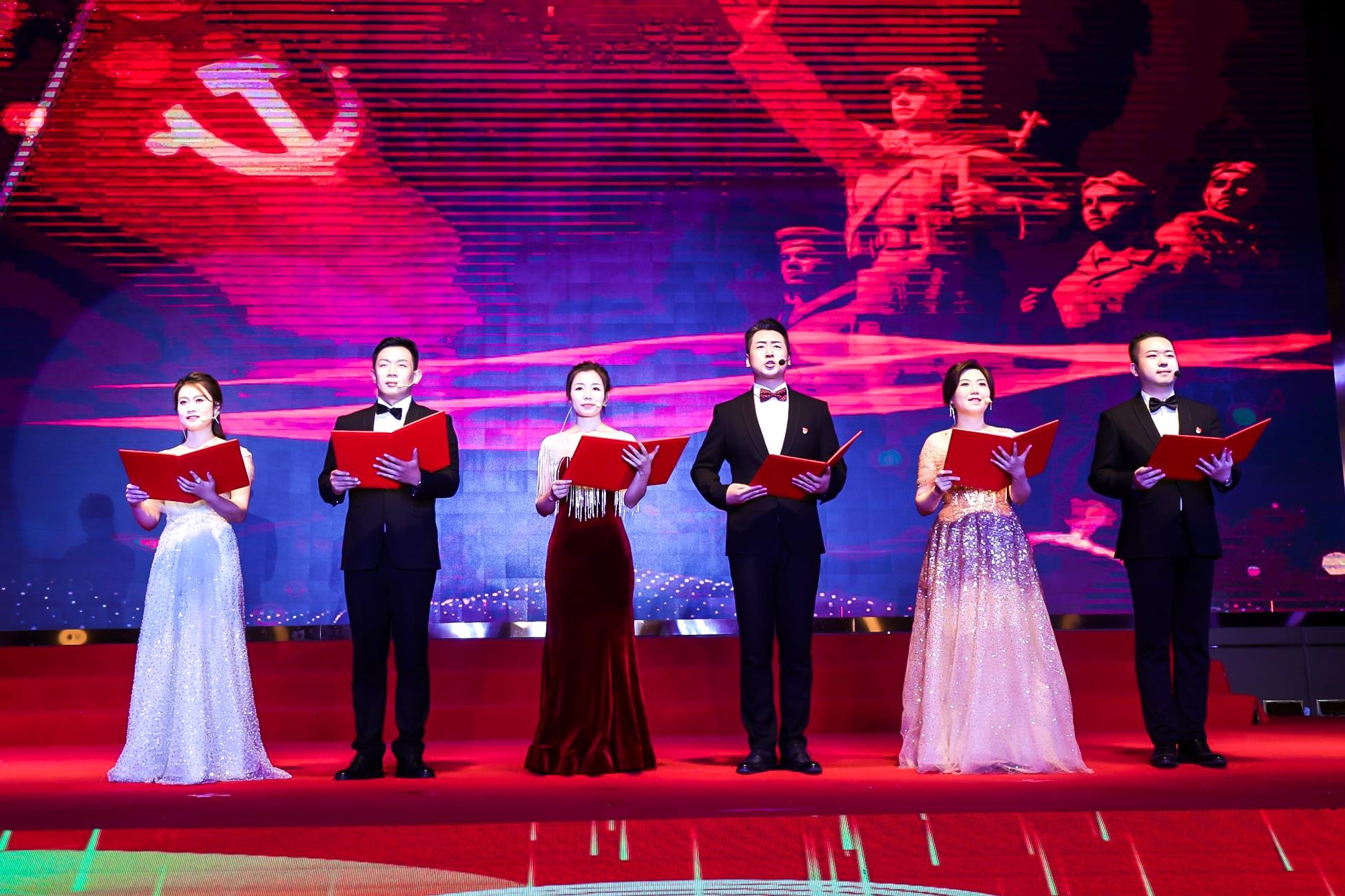 演出现场,灯火辉煌。舞台中央的LED大屏幕上,金色的党徽熠熠生辉,中国共产党成立100周年庆祝活动标识亮丽夺目。红色背景在璀璨的水晶灯的照射下,给金灿灿的天花板镀上一层鲜红,宛如早晨天边初生的朝霞,充满希望。慷慨激昂的暖场音乐,营造出和谐向上的良好氛围。