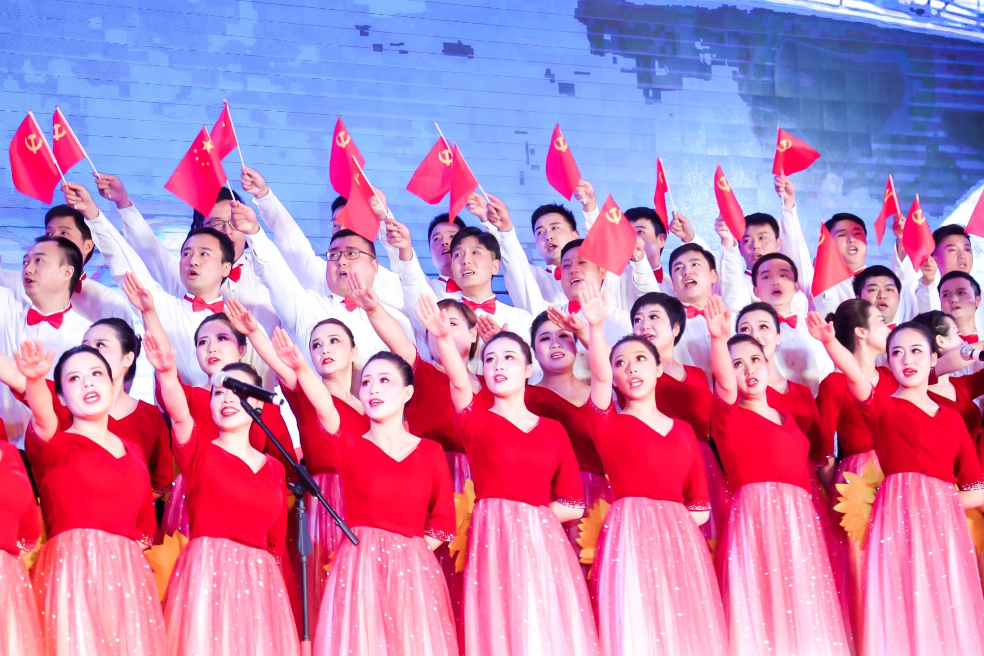 演出最后,全体起立,齐唱歌曲《没有共产党就没有新中国》。大家激动地挥舞着手中的旗帜,脸上洋溢着幸福的笑容,共同为中国共产党成立100周年华诞献上深情的祝福。