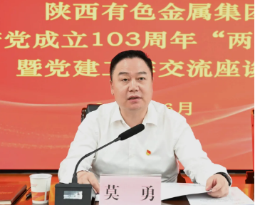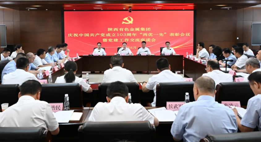 为庆祝中国共产党成立103周年,弘扬伟大建党精神,6月28日,陕西有色金属集团召开庆祝中国共产党成立103周年“两优一先”表彰会议暨党建工作交流座谈会。集团公司党委副书记、董事、总经理莫勇出席会议并讲话,党委副书记、董事、工会主席王小庆,省纪委监委驻陕西有色金属集团纪检监察组组长、党委委员、纪委书记李金涛出席会议,党委副书记郭仕龙主持会议。