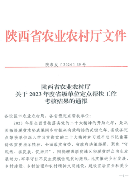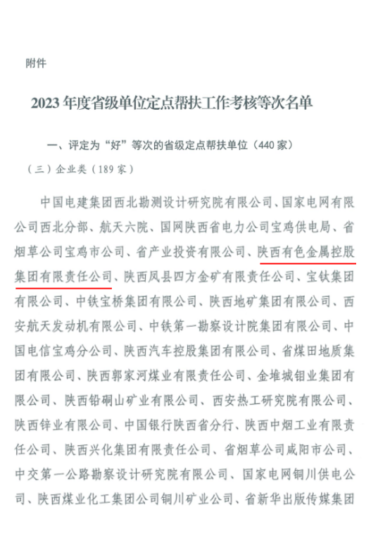 近日,陕西省农业农村厅印发《关于2023年度省级单位定点帮扶工作考核结果的通报》(陕农发〔2024〕39号),对2023年度全省定点帮扶工作考核结果进行通报,陕西有色金属集团被评为省级定点帮扶“好”等次单位,在进入巩固脱贫攻坚成果同乡村振兴有效衔接期连续三年获此殊荣。
