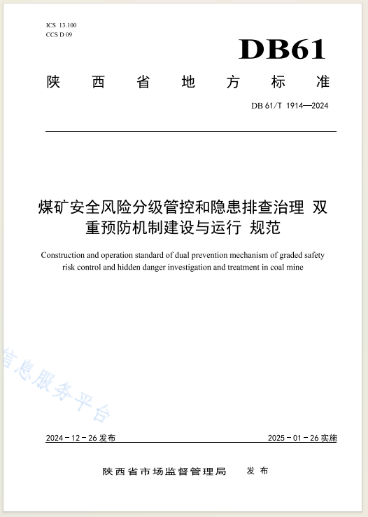 近日,陕西省发布《煤矿安全风险分级管控和隐患排查治理双重预防机制建设与运行规范》(DB61/T 1914-2024),并于2025年1月26日正式实施,由陕西省应急管理厅、中国矿业大学安全科学与应急管理研究院、星空体育最新官网等单位共同起草完成。