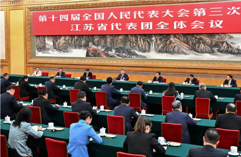 在听取大家发言后,习近平作了发言。他首先表示赞成政府工作报告,对江苏工作予以肯定,希望江苏落实好挑大梁的责任,努力取得新的更大成绩。