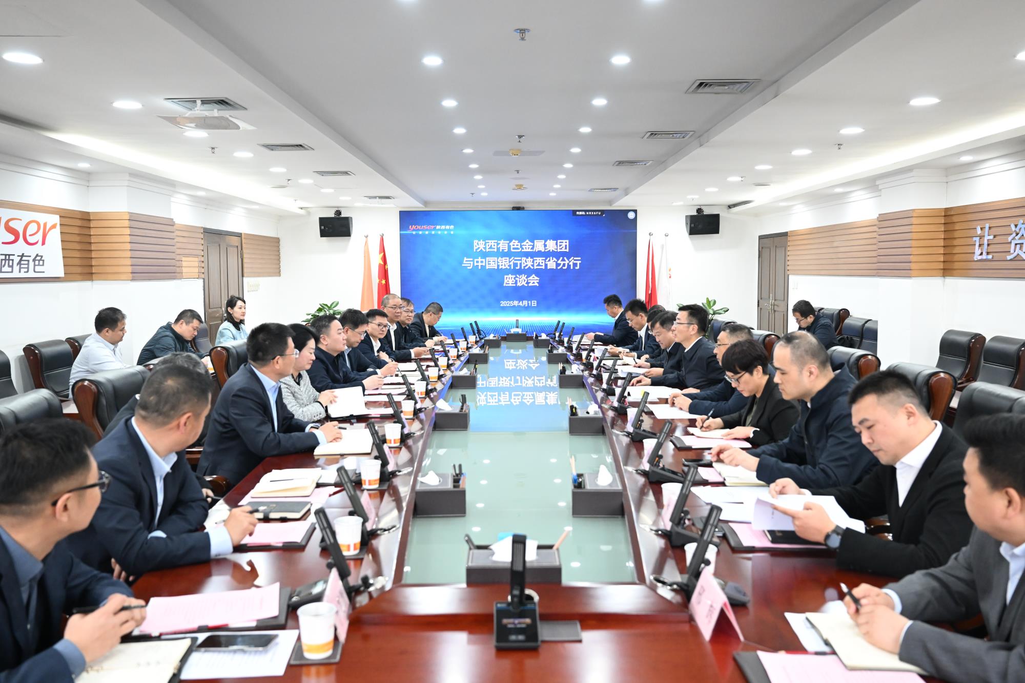 4月1日,陕西有色金属集团党委副书记、董事、总经理莫勇在集团总部接待了中国银行陕西省分行党委书记、行长蒙震一行,双方围绕深化银企合作、共同推动高质量发展进行座谈交流。中国银行陕西省分行党委委员、副行长刘继军、訾光锐,集团公司党委委员、总会计师李庆臻参加座谈。