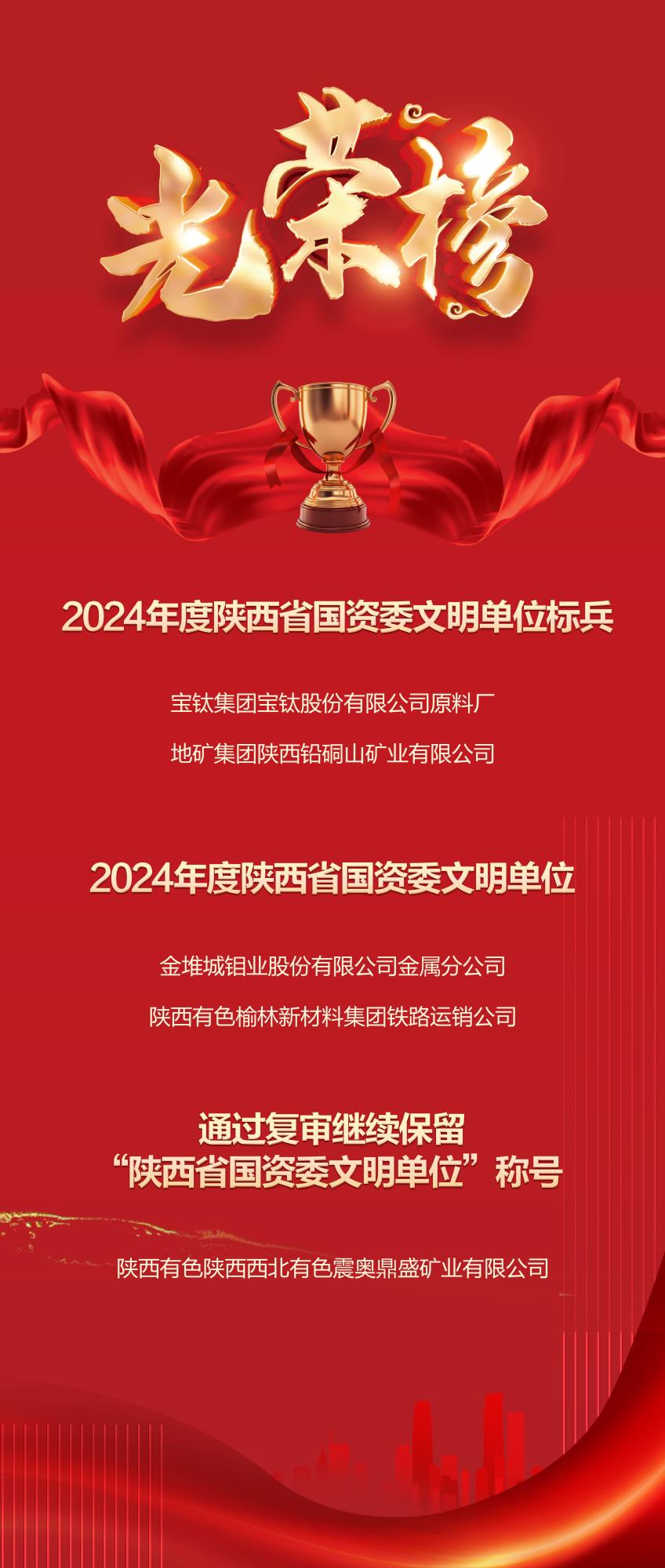 2024年度陕西省国资委文明单位标兵共31户,其中省属企业19户、驻陕央企12户;2024年度陕西省国资委文明单位共51户,其中省属企业33户、驻陕央企18户。宝钛集团宝钛股份有限公司原料厂、地矿集团陕西铅硐山矿业有限公司2户企业荣获“2024年度陕西省国资委文明单位标兵”称号;金堆城钼业股份有限公司金属分公司、陕西有色榆林新材料集团铁路运销公司2户企业荣获“2024年度陕西省国资委文明单位”称号;陕西有色陕西西北有色震奥鼎盛矿业有限公司通过复审继续保留“陕西省国资委文明单位”称号。