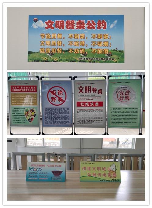 加大宣传,营造氛围。陕西美鑫公司始终秉承“一粥一饭当思来之不易,半缕半丝恒念物力维艰”的理念,通过QQ工作群、微信工作群、公司网站、公众号等各类平台,向广大干部职工普及餐桌文明知识,推广餐桌文明礼仪,倡导节约用餐行为。并在职工餐厅悬挂宣传条幅,张贴“文明餐桌行动”宣传画及“文明餐桌行动”告示牌、循环滚动播放宣传标语等多种方式大张旗鼓宣传“文明餐桌”实践活动的重要意义,为文明餐桌行动营造了良好的氛围。