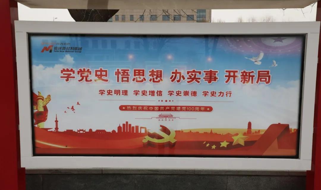 坚持守正创新,营造浓厚氛围。榆林新材料集团严格厉行宣传工作使命,紧抓习近平总书记在党史学习教育动员大会上重要讲话重要指示精神的实质、核心要义,在“融”字上做文章,在“新”字上求突破,结合公司现有宣传点位,充分利用微信公众号、电子大屏、电视台、宣传栏等现有宣传载体,常态化推送党史学习教育稿件13篇,电子大屏滚动播放党史学习教育视频,制作宣传栏17版,悬挂横幅20条。同时,购买《中国共产党简史》、《论中国共产党历史》等党史学习教育书籍90套。