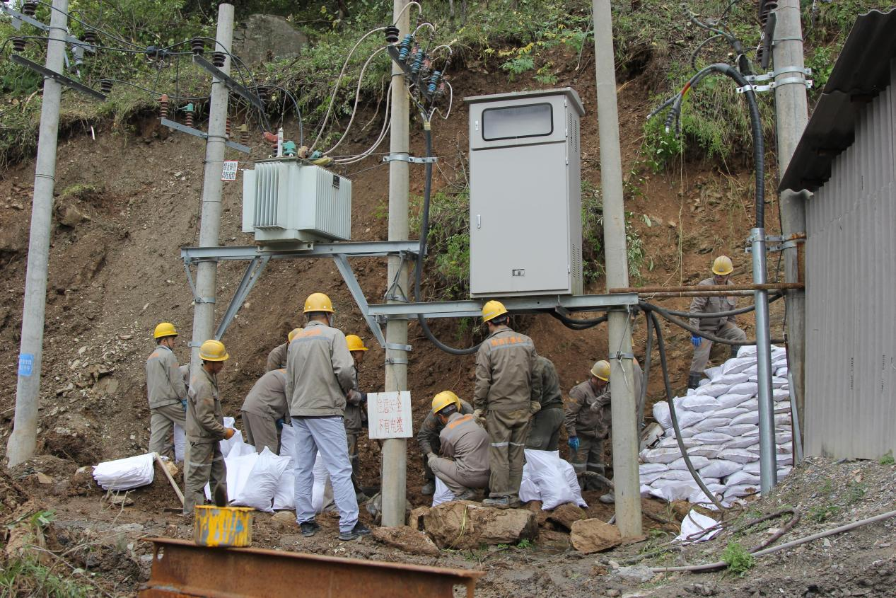 受滑坡影响,采矿工区新通风井高压计量开关柜受挤压严重变形,作业人员现场勘察后,采用轻轨每间隔30厘米打桩加固,并用双层装土编织袋稳固坡体。矿区大门山体滑坡导致道路淤堵,公司组织职工用铁锹清理的同时,调用挖掘机、装载机对下滑坡体进行清理,并针对办公及宿舍区域后山公路塌方的情况,第一时间撤离人员,清淤并沿路堆砌挡水围墙,防止雨水流入引发次生地质灾害。在选厂乾沟尾矿库变压器坠落导致区间停电的情况下,选矿厂组建三个抢修班,清理灾点泥石,抢修高压线路,高效完成电缆铺设任务,保证了乾沟尾矿库的正常生产。