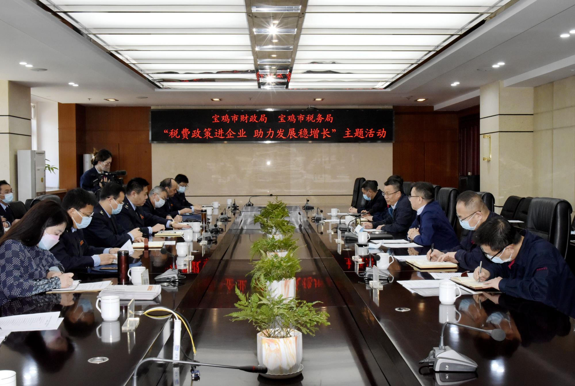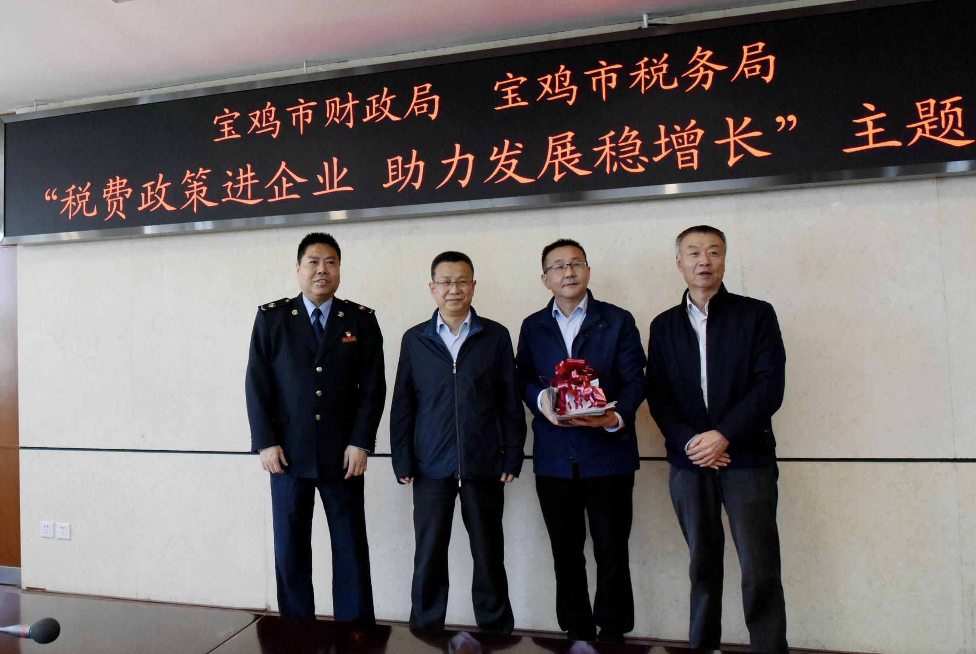 4月25日,宝鸡市市税务局党委书记、局长程涛,市财政局党组成员、副局长张晔平一行来到宝钛集团,开展“税费政策进企业 助力发展稳增长”主题活动。宝钛集团党委副书记、总经理雷让岐,总会计师余和明及相关部门负责人参加活动。