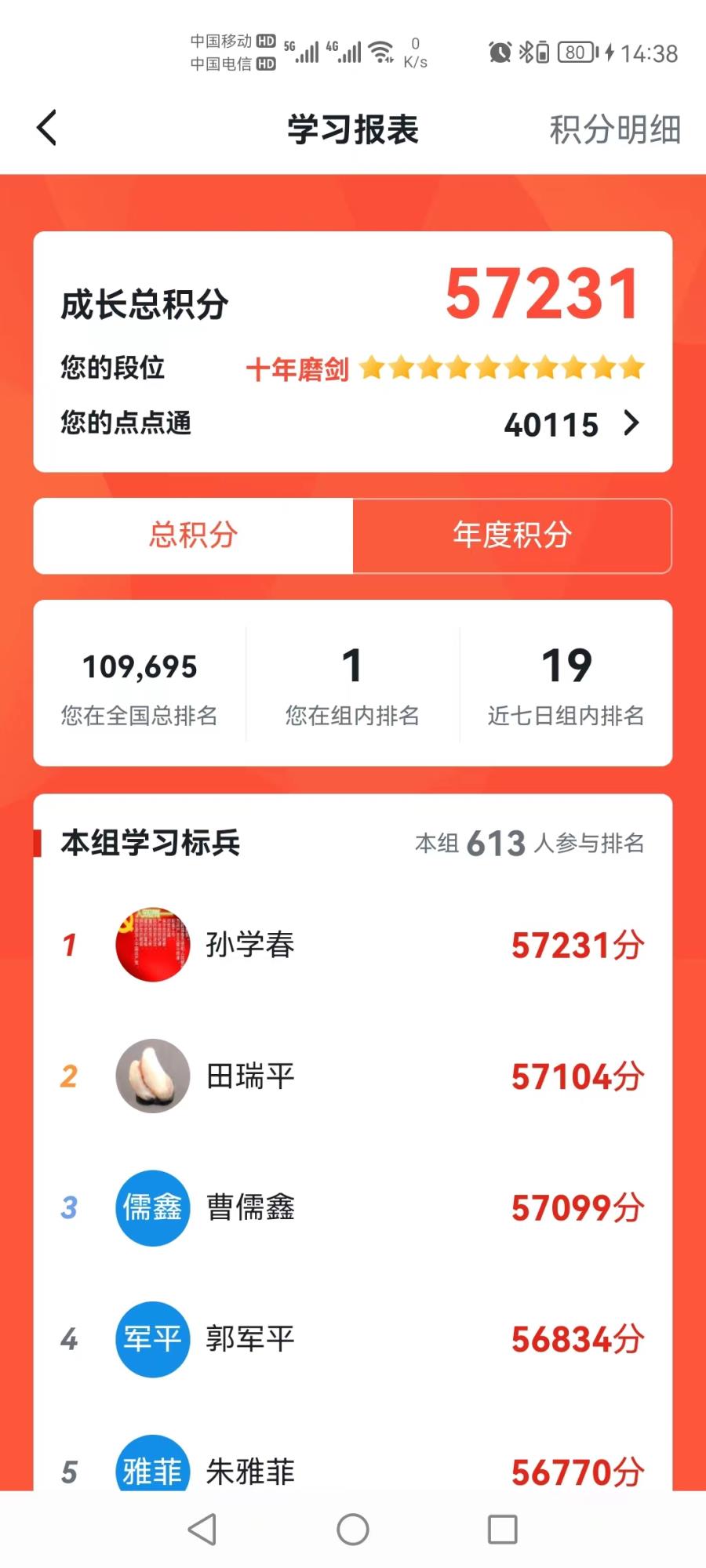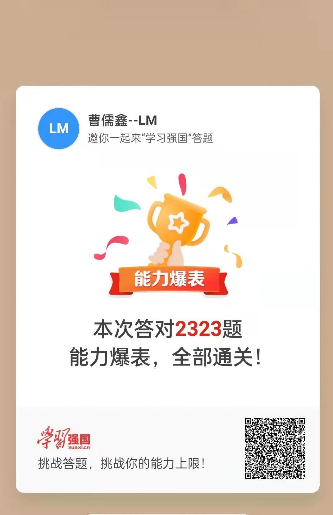 目前,全公司共有注册学员613人,学员参与度、活跃度均在陕西有色金属集团各单位长期处于领先位次,日均积分经常位居第一名。截止4月27日,铝业分公司孙学春以总积分57289分,排名全国第108949名,2022年度积分5848分,排名全国第1188名,全公司学习强国学员总积分55000分以上达136人,党委宣传部田瑞平和阳极分公司曹儒鑫挑战答题先后以2288和2323题顺利通关。