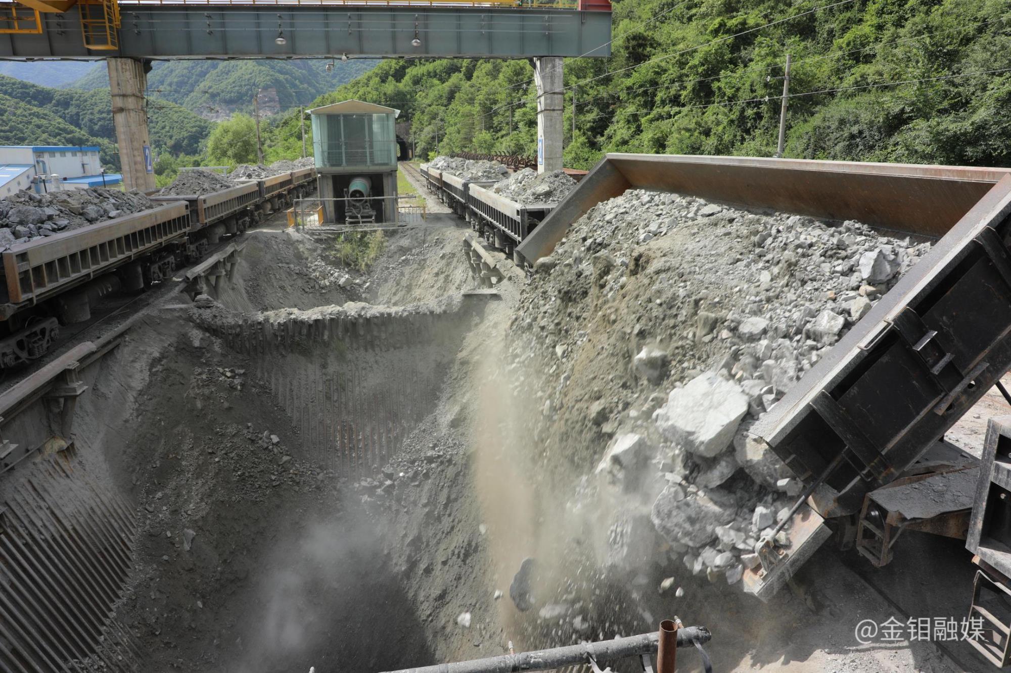 电机车正在向矿仓翻卸矿石