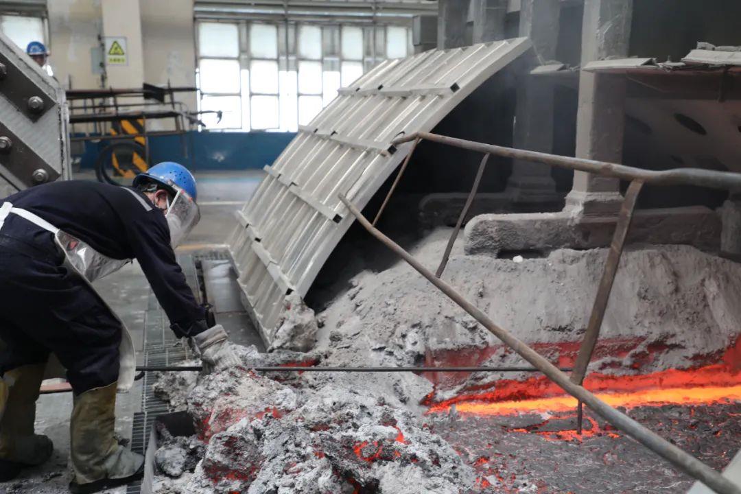 在阳极分公司焙烧车间,一排排坐落有序的焙烧室正在进行阳极生块焙烧,通过火眼能看到里面火热的生产场景……