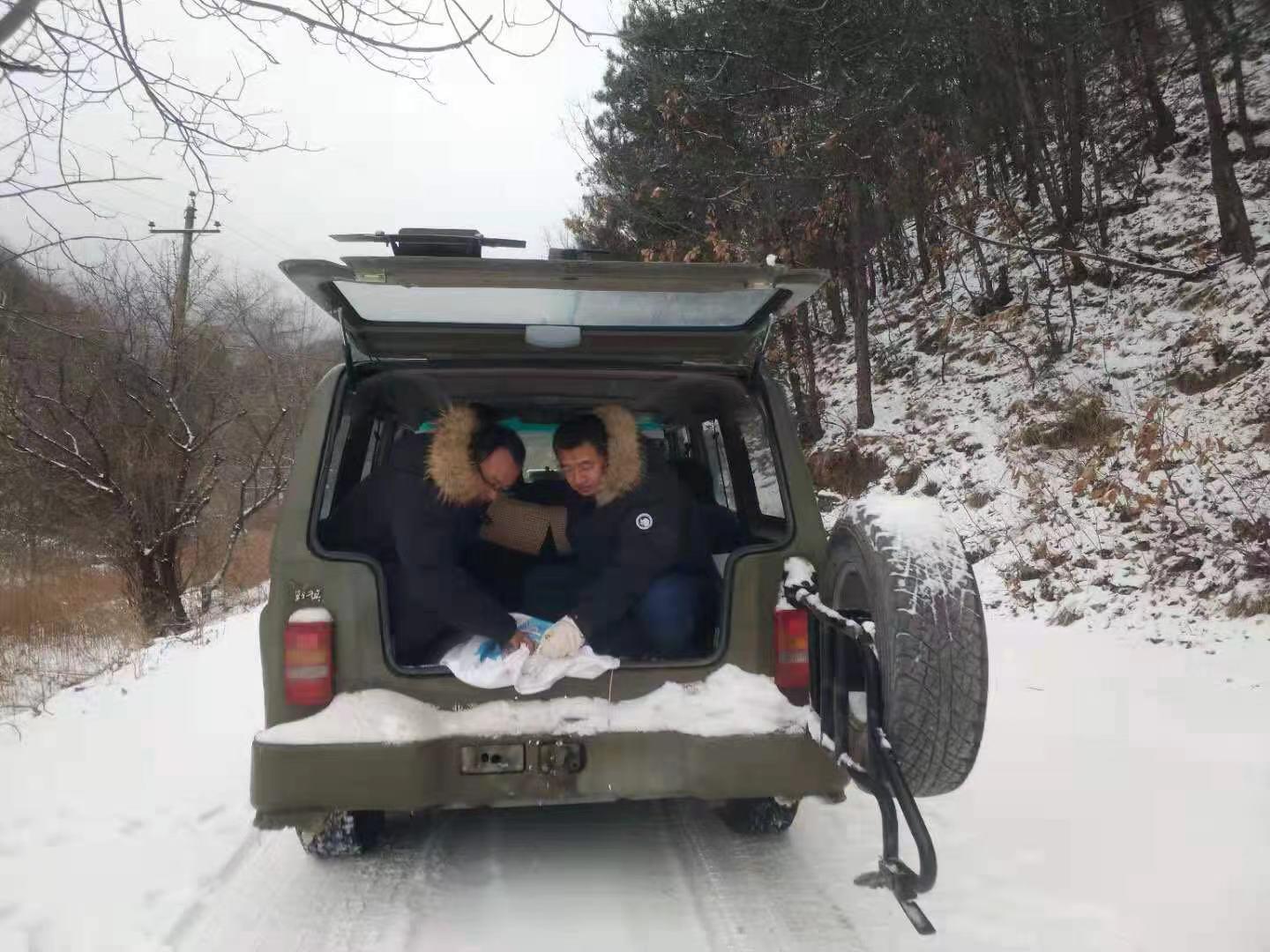 刘斌(右一)和驻村工作队抛洒消雪剂,方便群众安全出行