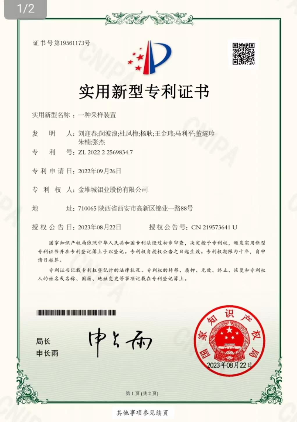 近日,金钼集团矿山分公司研发的《一种采样装置》被国家知识产权局授予实用新型专利证书。