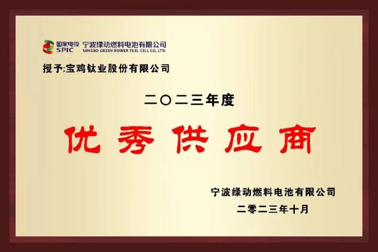 近日,宝钛股份在国家电投宁波绿动燃料电池有限公司供应商评比中,荣获“优秀供应商”称号。