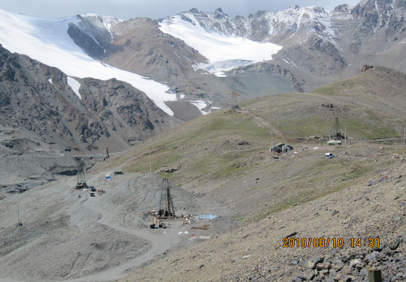 (2010年,新疆和静县诺尔湖铁矿钻探施工现场冰川长年不化,钻机坐在永冻层上钻进施工)