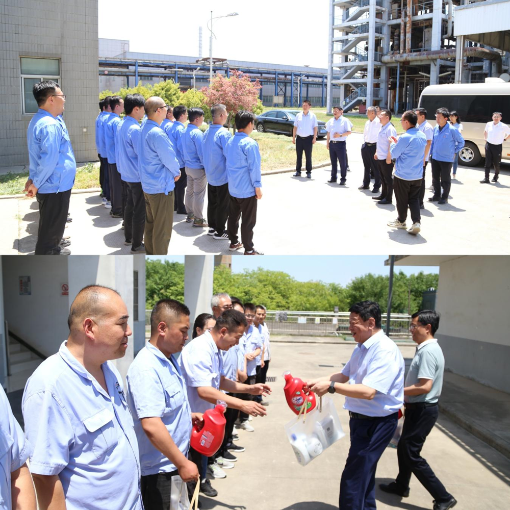 中午13点30分,霍学杰一行一下车,直接来到天宏硅业化学工艺车间、光电科技动能中心,代表集团公司党委、工会向生产一线的职工们送上防暑降温慰问品,叮嘱大家做好自身防护。
