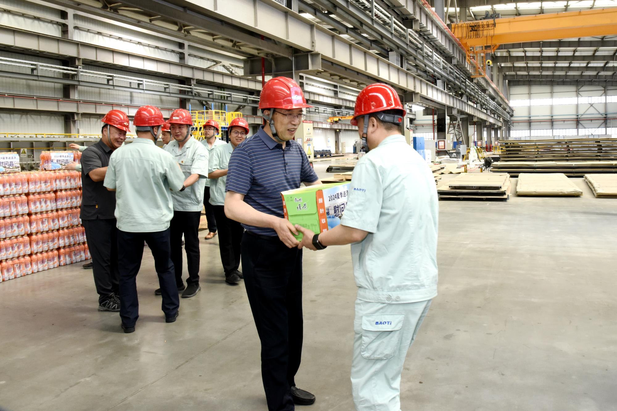 6月18日,陕西有色金属集团党委委员、省纪委监委驻集团公司纪检监察组组长、集团公司纪委书记、第四督导检查组组长李金涛一行赴宝钛集团,督导检查“六项重点工作”、安全环保、党纪学习教育工作安排和落实情况,并深入生产现场实地调研,看望慰问一线职工,为他们送去防暑降温品。宝钛集团领导班子成员王俭、贺治民等陪同并座谈。