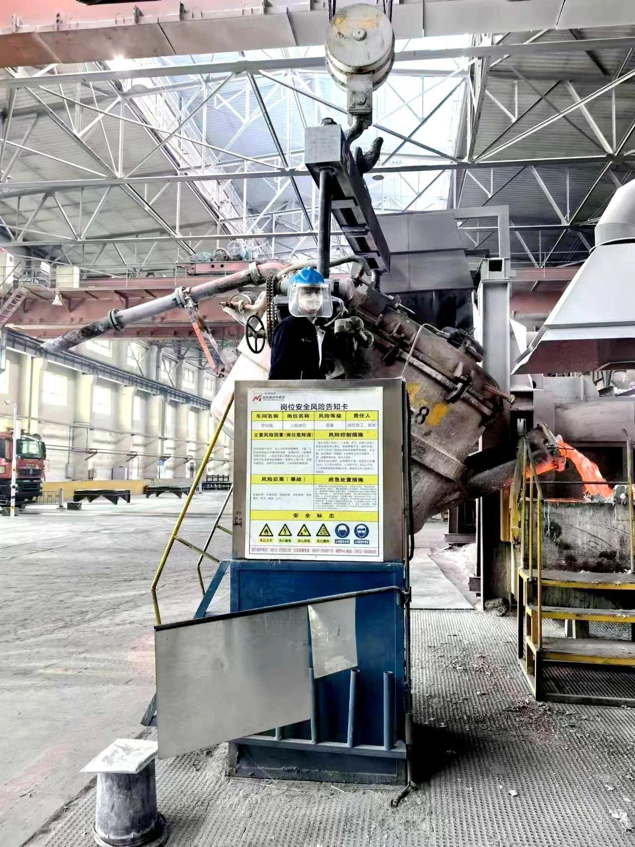 在内装900℃铝液的抬包旁,铸造工刘亚辉正在进行入铝作业。