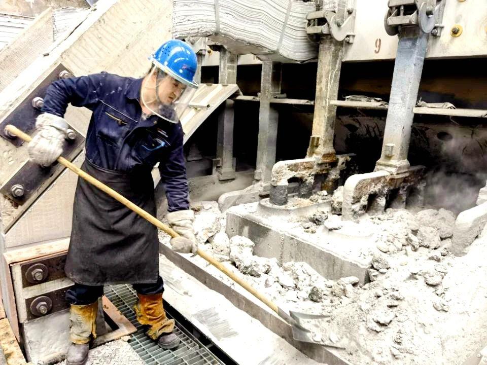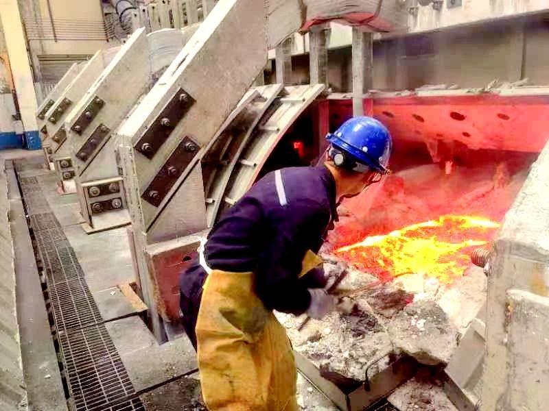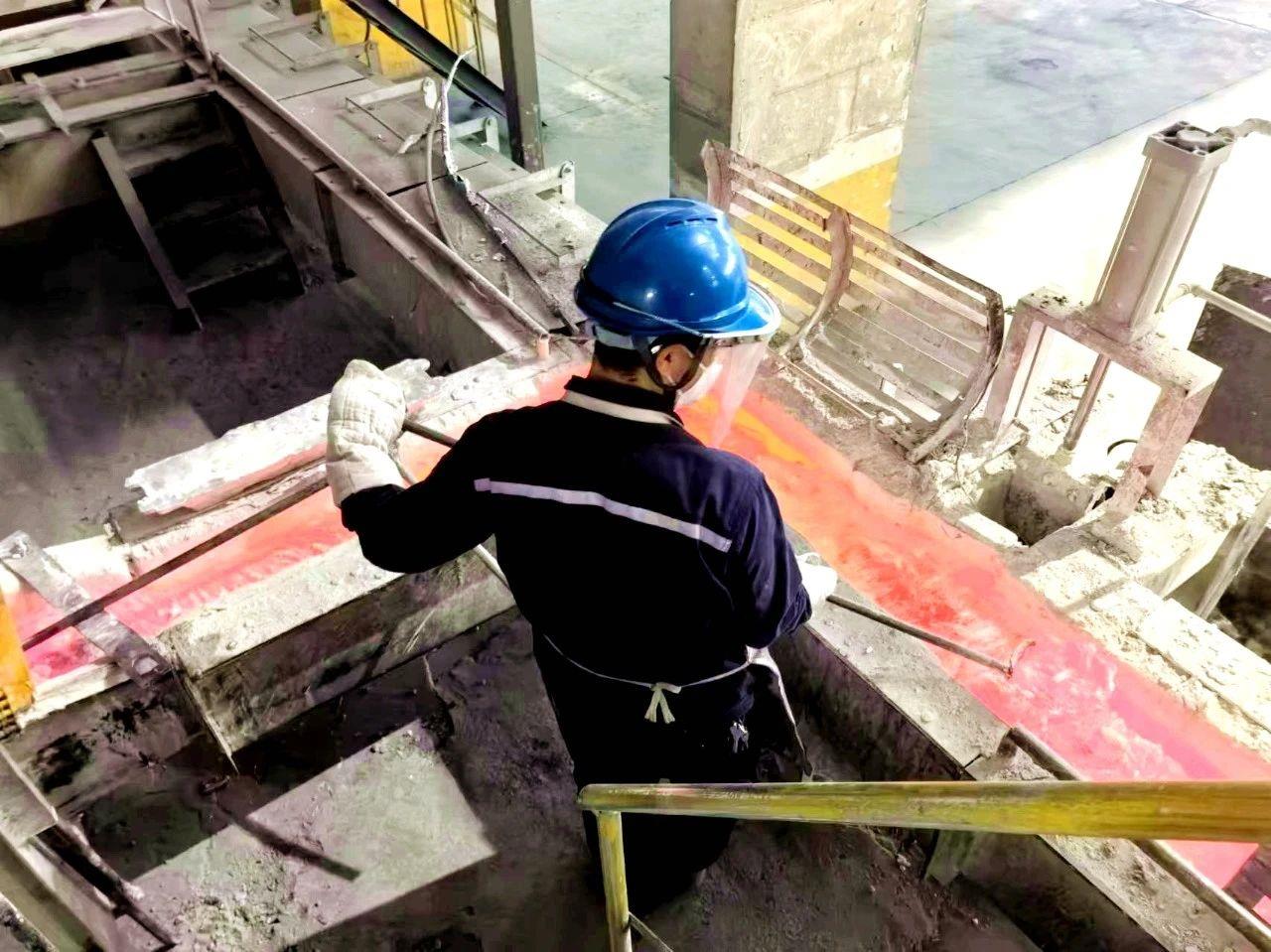 在800℃铝液的混合炉溜槽旁,铸造工王东平正在进行捞渣作业。